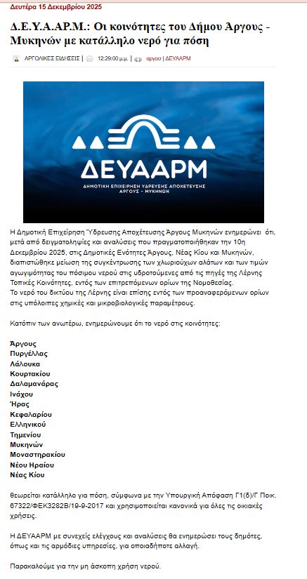 ΑΡΓΟΣ – ΓΙΑ ΤΟ ΝΕΡΟ ΠΟΥ ΠΙΝΟΥΜΕ
