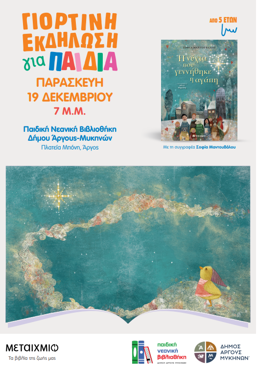 Η Παιδική – Νεανική Βιβλιοθήκη Δήμου Άργους-Μυκηνών διοργανώνει μια ξεχωριστή γιορτινή εκδήλωση για παιδιά, την Παρασκευή 19 Δεκεμβρίου 2025, στις 7.00 μ.μ., στον χώρο της βιβλιοθήκης (Πάρκο Μπόνη, Άργος).