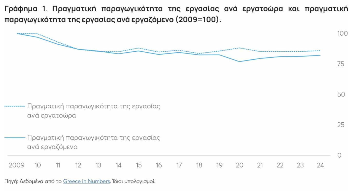 H παραγωγικότητα της εργασίας στην Ελλάδα το 2024 παραμένει έως 18% χαμηλότερη σε σχέση με το 2009
