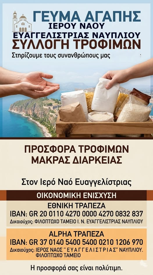 Εν όψει των αγίων ημερών της Αναστάσεως του Κυρίου μας, κατά τις οποίες η Εκκλησία μας καλεί όλους σε έμπρακτη μαρτυρία αγάπης και αλληλεγγύης προς τον συνάνθρωπο, ο Ιερός Ναός Ευαγγελιστρίας Ναυπλίου απευθύνει έκκληση προς όλους, να συνδράμουν, κατά δύναμη, στην ενίσχυση του καθημερινού Γεύματος Αγάπης της Ενορίας μας.