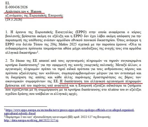 Ο αμαρτωλός ΟΠΕΚΕΠΕ έπαψε, από τον Σεπτέμβριο 2024, να είναι πιστοποιημένος από την Ε.Ε. Σήμερα, 1,5 χρόνο μετά και παρά την πολυδιαφημισμένη μεταρρύθμιση της μεταφοράς του στην ΑΑΔΕ, ο “νέος” ΟΠΕΚΕΠΕ της κυβέρνησης της Ν.Δ. εξακολουθεί να μην είναι διαπιστευμένος, όπως φαίνεται και από την απάντηση που έστειλε σε σχετική ερώτησή μου ο Ευρωπαίος Επίτροπος Hansen.